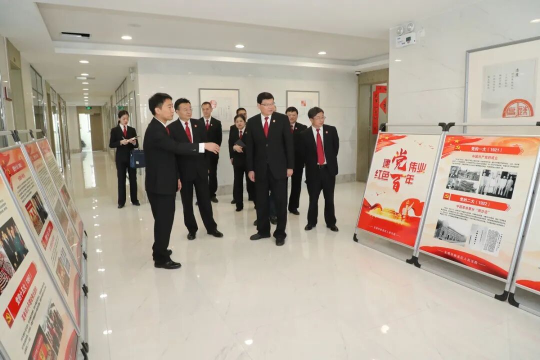 在江溪法庭,钱斌院长视察了法庭诉讼服务大厅、党员活动室、法庭建设展示室等地,查阅了教育整顿工作台账和干警学习笔记,听取了江溪法庭创新打造“基层矛盾就地吸附网络”“涉诉纠纷联动化解网络”“村官法官工作协作网络”工作机制的介绍。