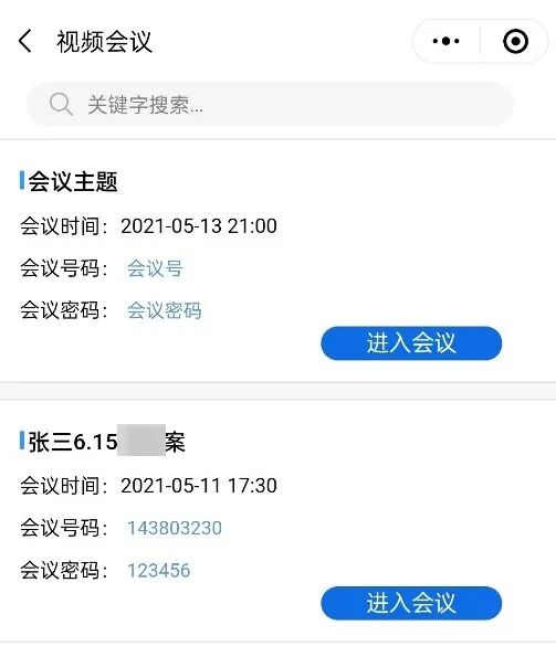 您还可以在“e律通”小程序上与检察官/法官通过视频会议,您可在“视频会议”界面选择对应的会议,点击“进入会议”按钮即可打开链接或打开APP进入会议。相关的会议内容、会议时间、参会人员会提前以短信的方式发送至您的手机中,请注意查看,以免错过会议时间。