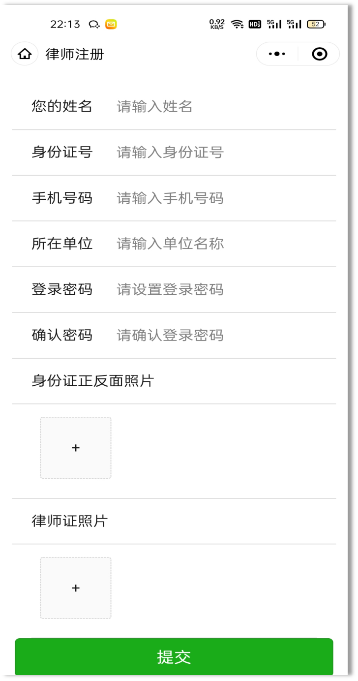 注册账号时,需要如实填写身份信息,包括身份证号、手机号码、所在单位并确认登录密码,两次输入的密码需要一致,同时还需上传您的身份证正反面照片和律师证照片,所有信息填写完毕后点击“提交”按钮即可提交。