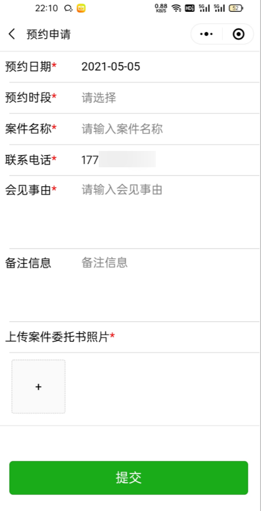 如果您需要与检察官/法官见面,可填写预约申请。您的单位、姓名、联系电话、律师证照片将会根据您的注册信息自动填写,您只需要填写预约日期、预约时段、案件名称、会见事由并上传相关的案件委托书照片。