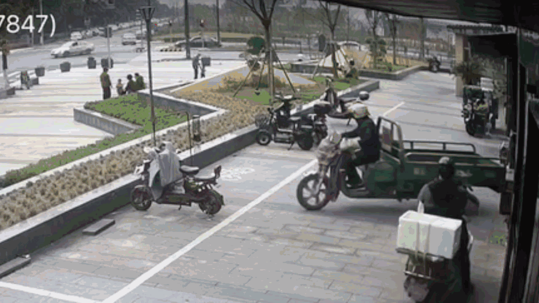 幸好拖把头较大,支棱着拖把杆挂在了雨棚上,也幸好棚下骑车经过的常某某,在拖把掉落的千钧一发之际往前挪动了一下车。要不然,这后果真是不敢想象啊!