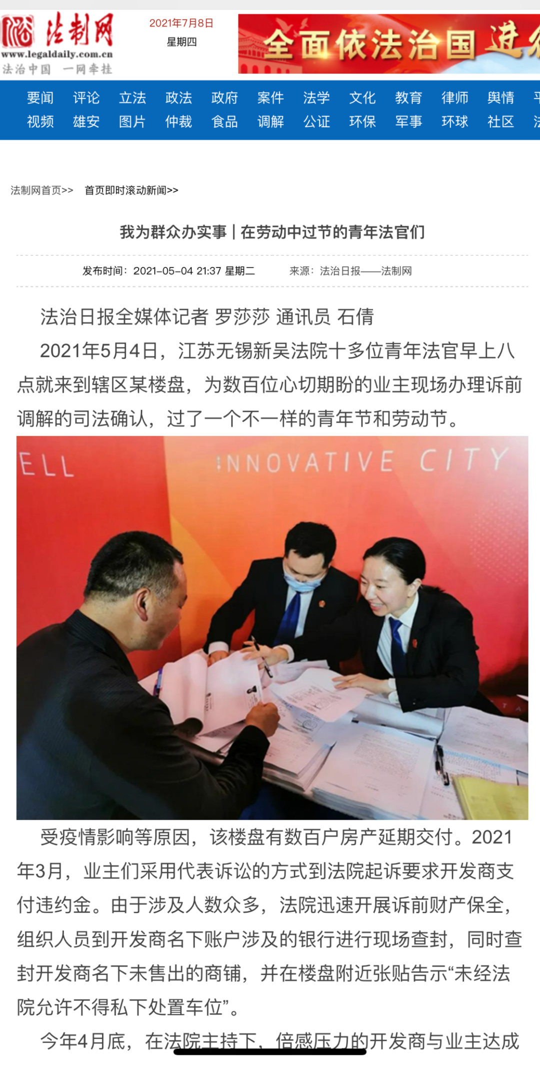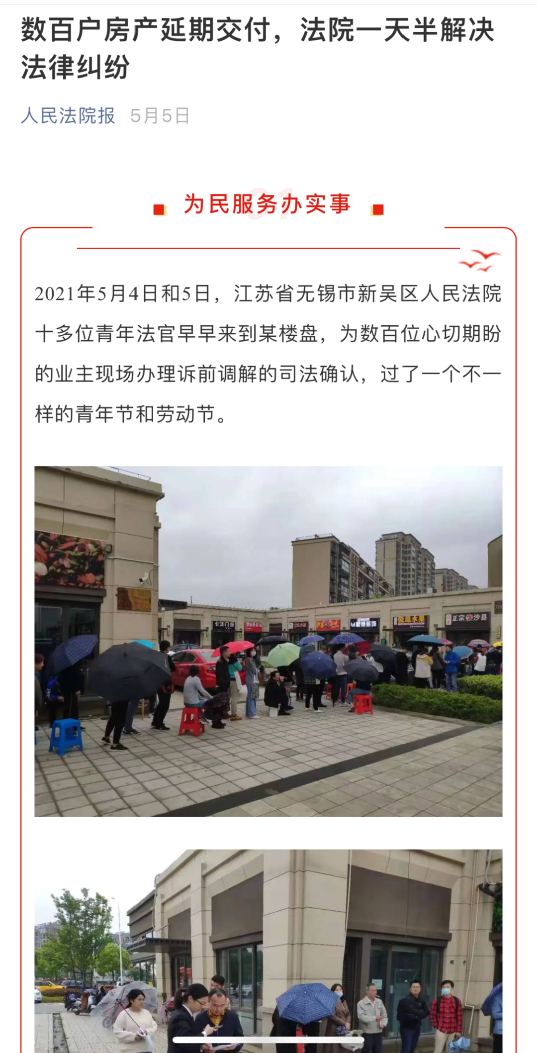 坚持多元解纷,积极研磨社情民意中的痛点难点,从党建联盟、法治宣传、矛盾化解、机制构建等四方面着力,对接社区街道及兄弟单位,有针对性地开展指导、解纷及培训工作。如灵活运用诉讼代表人制度,一次性为107户业主梳纡解难,五一假期加班加点为510户买房群众“一站式”办妥法律手续,相关情况被人民网、法制网、《人民法院报》《江苏法治报》等主流媒体报道。