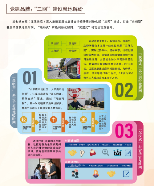 新吴法院第七党支部(江溪人民法庭)始终坚持以党的政治建设为纲领,紧紧围绕“抓党建带队建促审判”的工作思路,扎实推进基层党组织标准化、规范化、制度化建设,创新党建工作理念,丰富党建工作载体,着力打造支部“基层矛盾就地吸附网”“涉诉纠纷联动化解网”“法官村官工作协助网”为一体的“三张网”品牌建设,将党建和审判业务相结合,坚持党建引领,积极推进基层社会治理法治化,为辖区经济健康发展、社会和谐稳定提供了有力的司法服务和保障,品牌经验被“学习强国”刊载。
