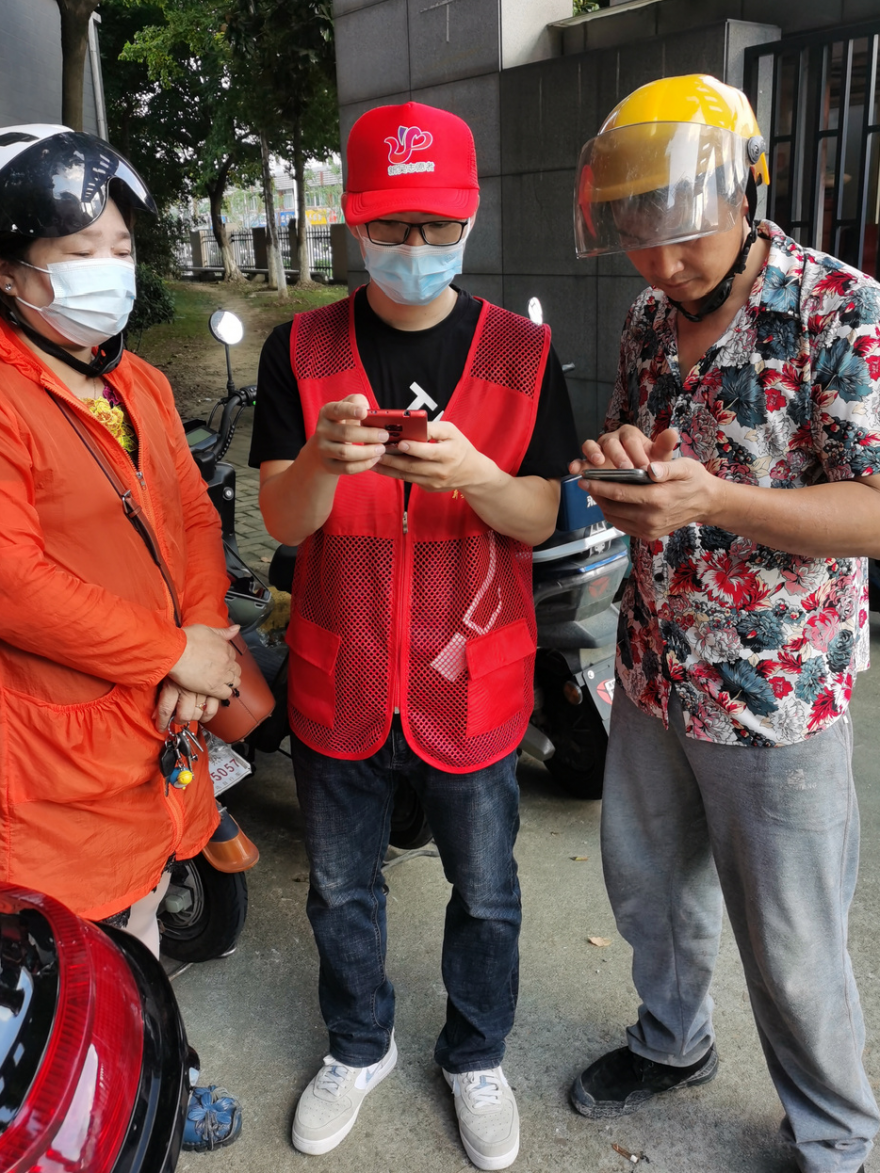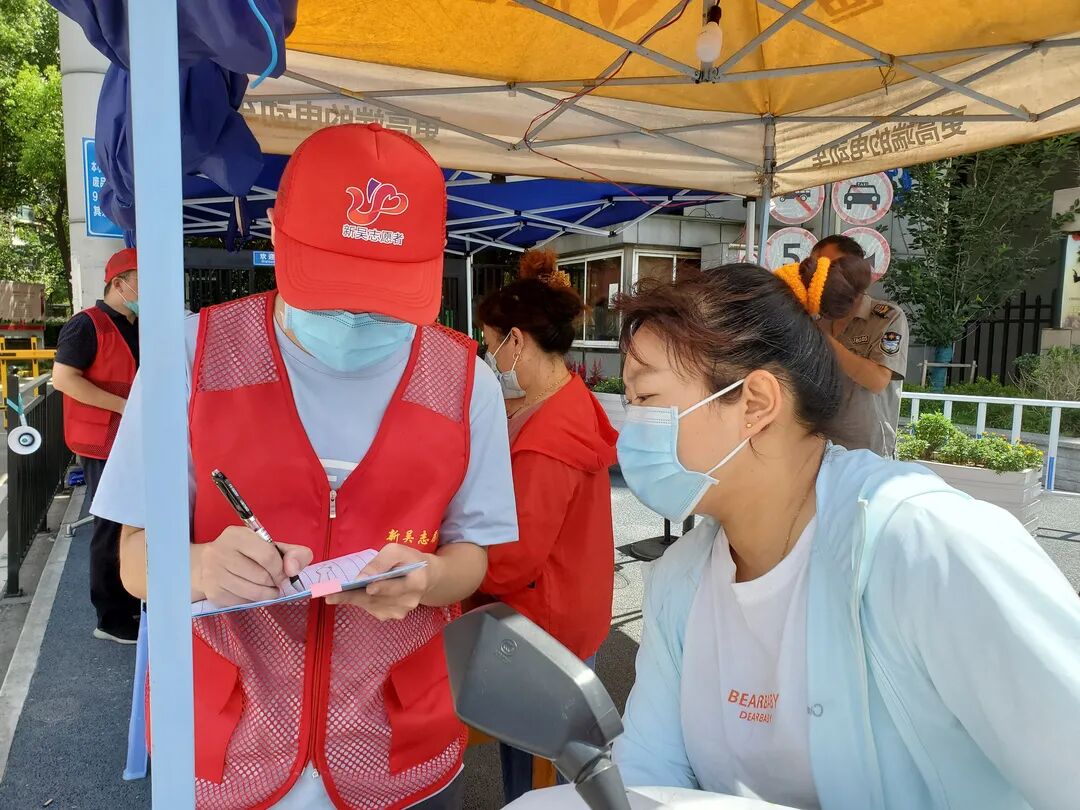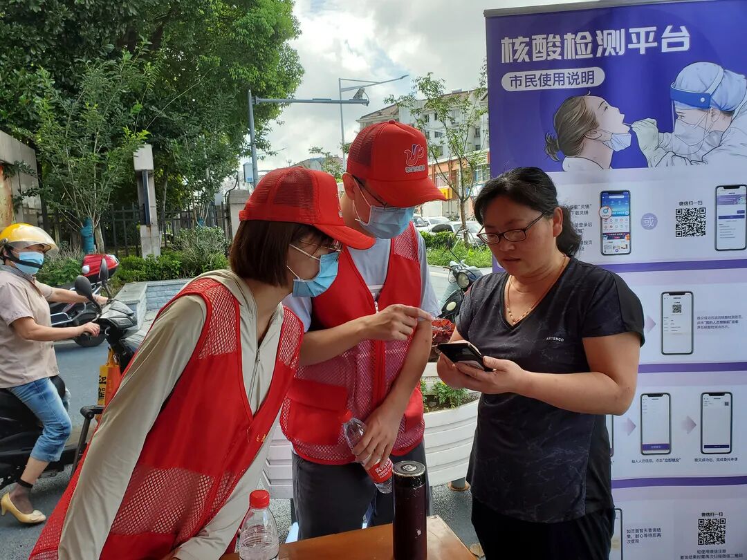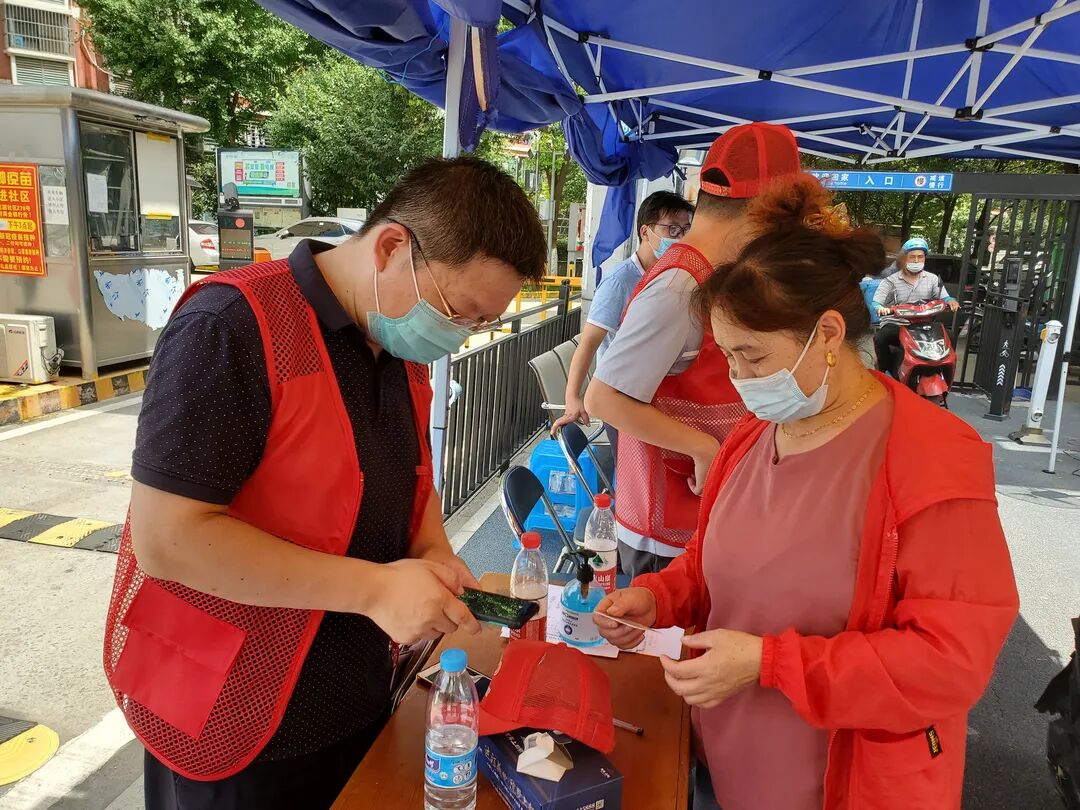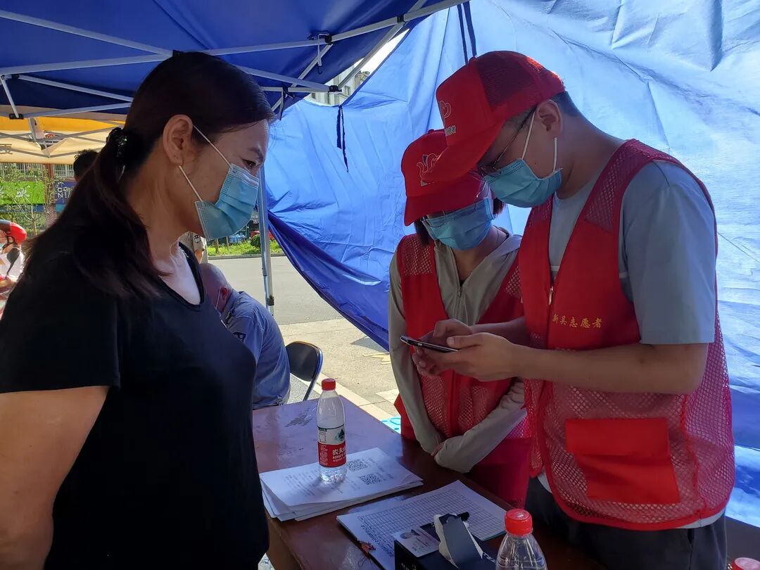 前进花园社区出入口处,志愿者们顶着炎炎烈日,耐心地帮助来往居民完成“灵锡”APP下载和核酸检测人员预制码申请工作。