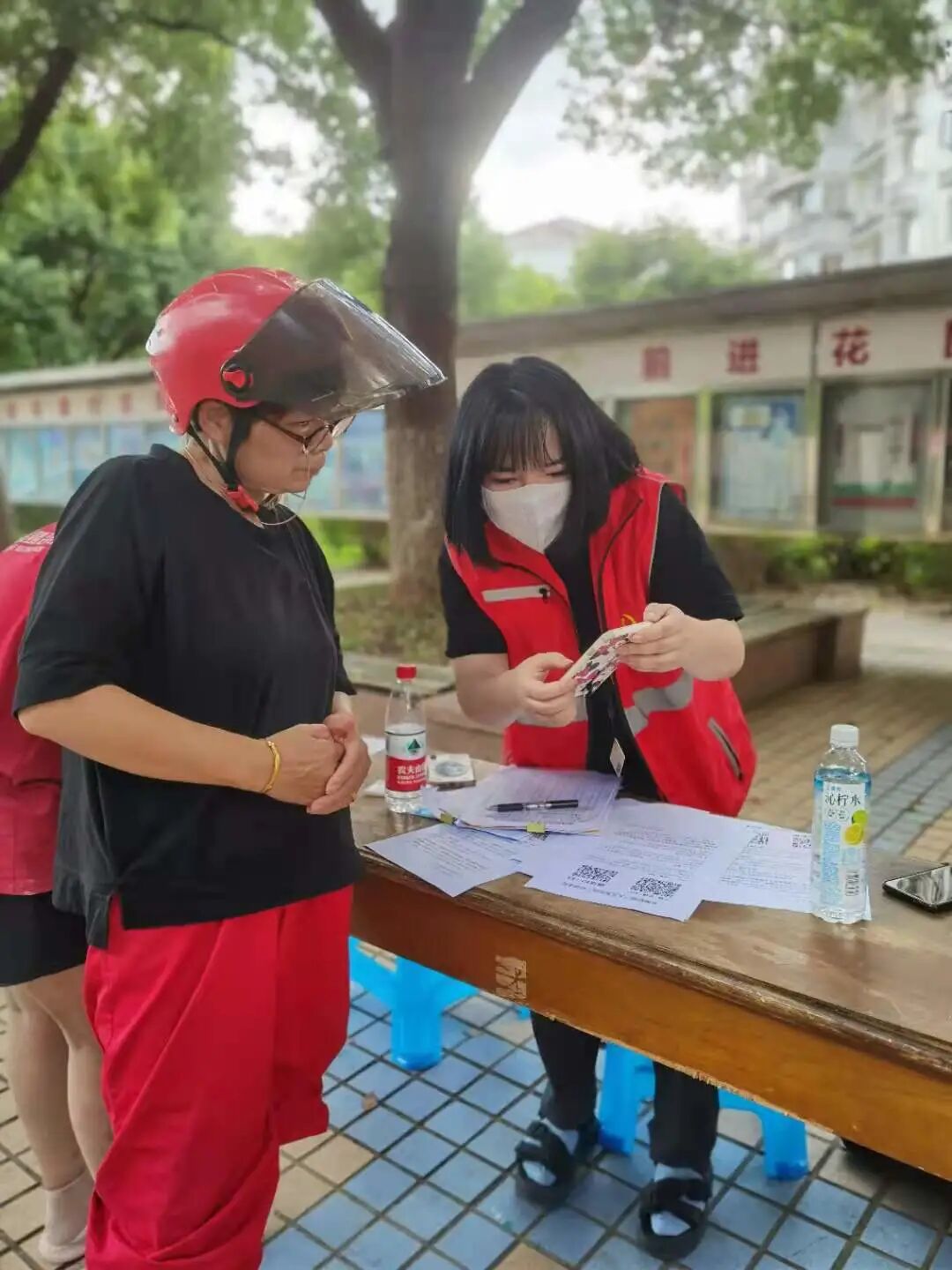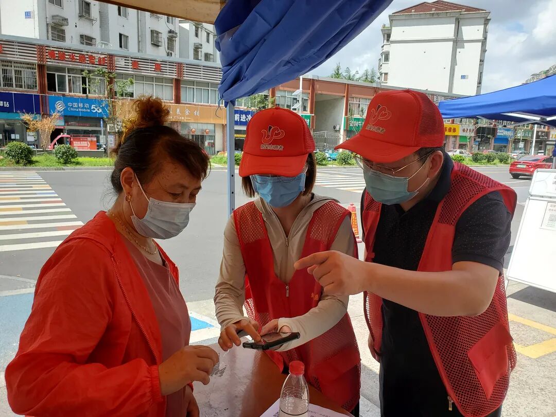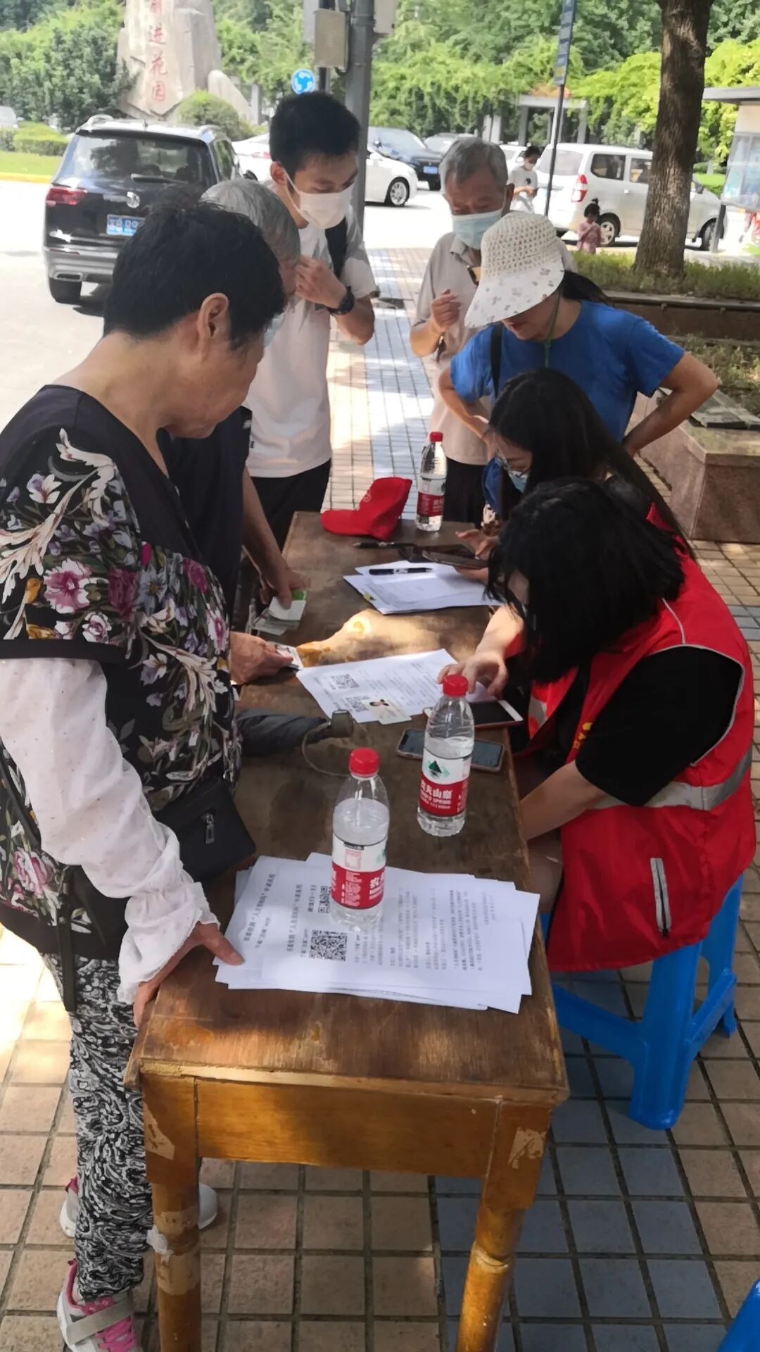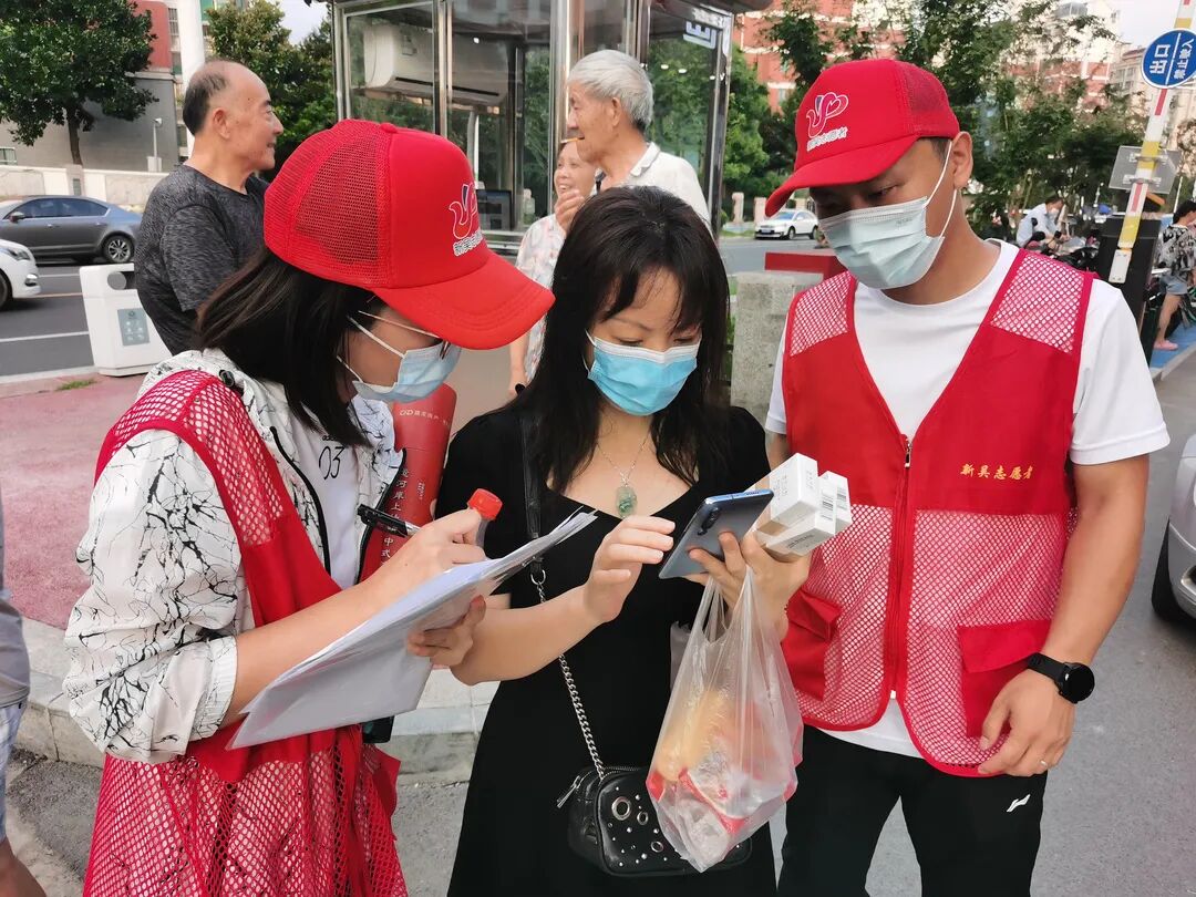 前进花园社区出入口处,志愿者们顶着炎炎烈日,耐心地帮助来往居民完成“灵锡”APP下载和核酸检测人员预制码申请工作。