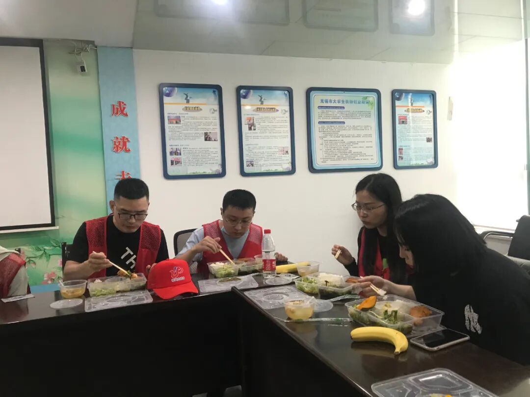忙碌后,志愿者们终于有时间坐下来休息一会儿。有的人全身大汗,有的人喉咙嘶哑,可大家似乎毫不在意,围坐在一起,大口地吃起了盒饭。