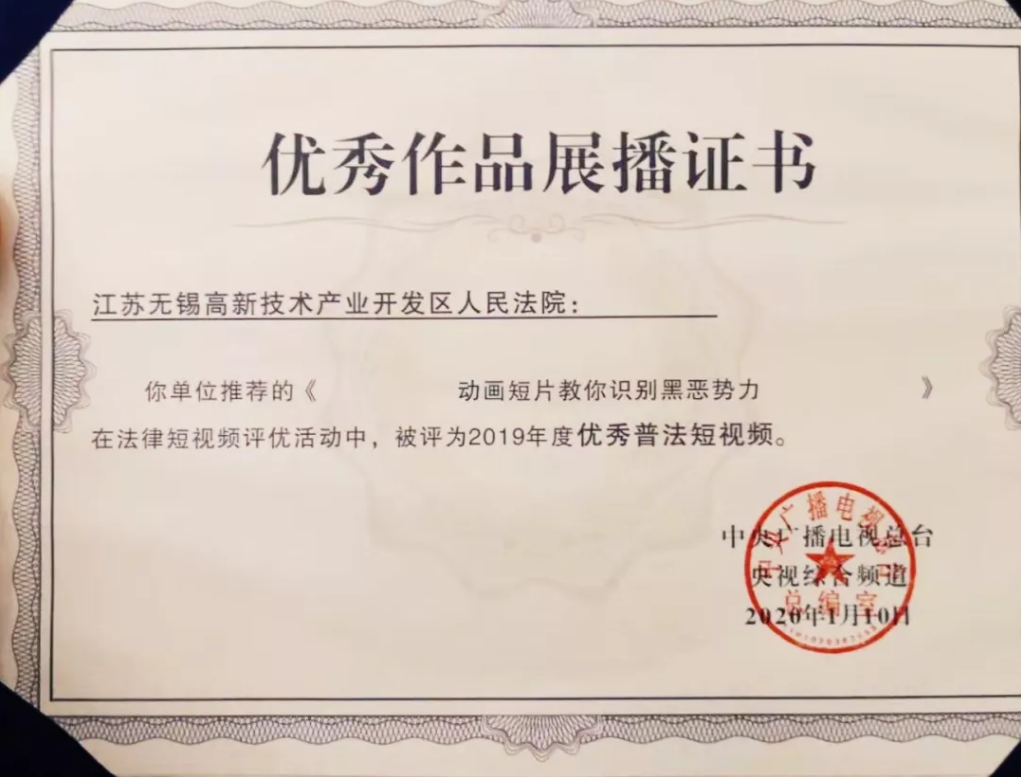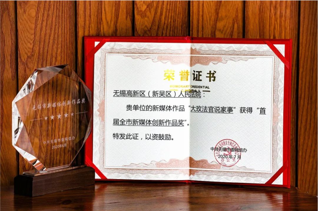 该院司法宣传工作于2019年7月被最高法院通报表扬;培育打造的“大玫法官说家事”漫画普法专栏受到最高法院、省高院关注,并获得无锡市首届新媒体创新作品奖、无锡市法治惠民实事工程一等奖;制作的《擦亮眼睛!三分钟动漫短片教你识别黑恶势力》获得全国十佳“优秀普法短视频作品”。