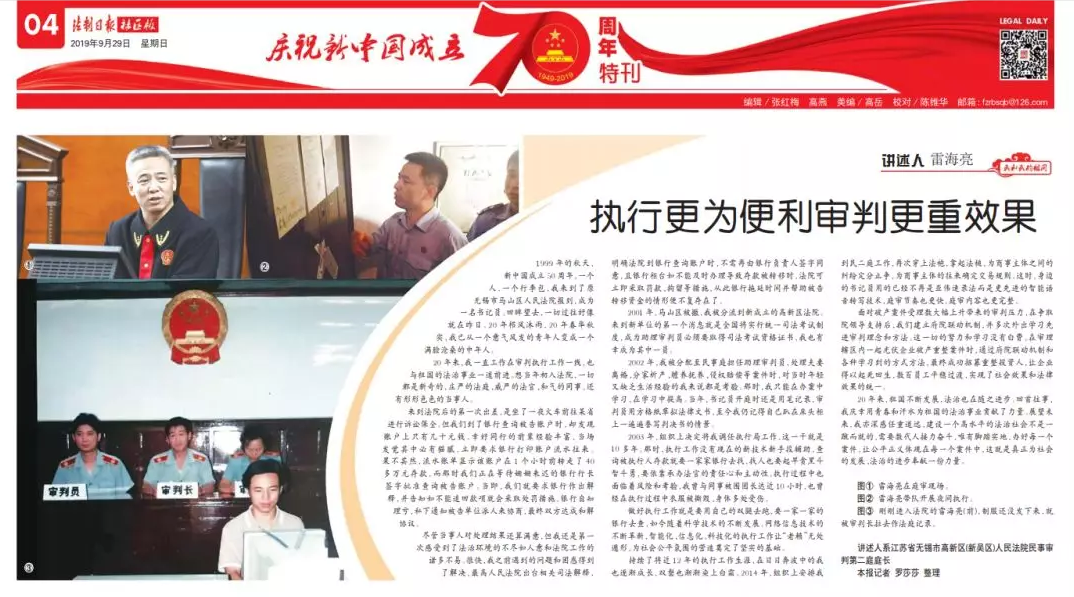 在《法制日报》“庆祝新中国成立70周年”特刊上刊登《执行更为便利审判更重效果》人物故事