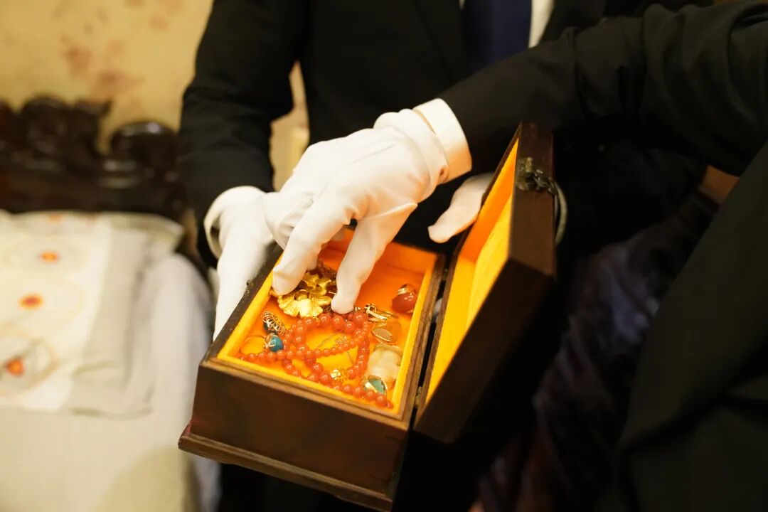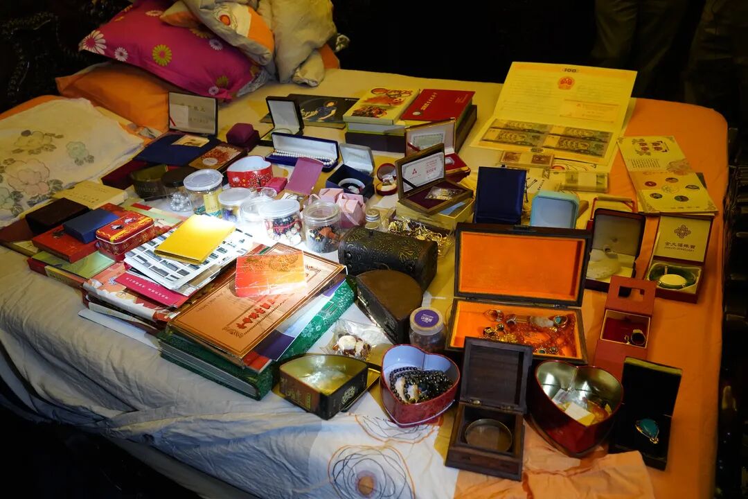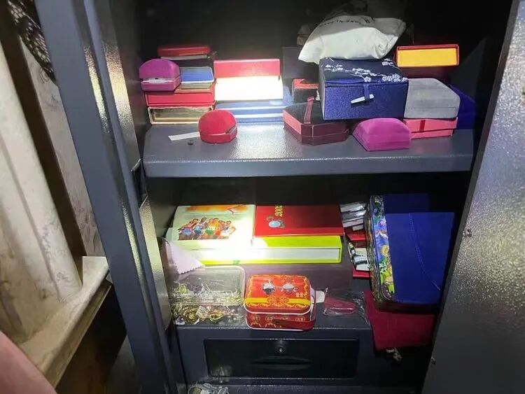 但上述这些,在执行干警随后打开的保险柜面前,都成了“小场面”——翡翠、玉镯、纪念币、黄金、蜜蜡、绿松石、戒指项链和手镯、串珠等等贵重物品,多到小编认不全。可以说,在场的除了“富贵”二人,大家都被这铺满一床的财物震撼到了。