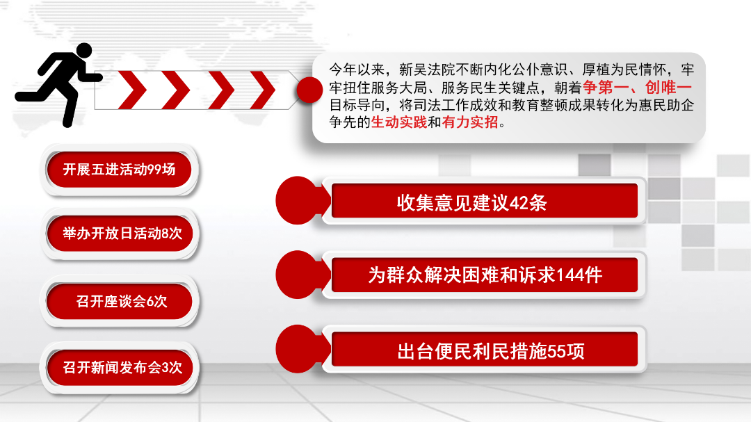 今年以来,新吴法院不断内化公仆意识、厚植为民情怀,牢牢扭住服务大局、服务民生关键点,朝着争第一、创唯一目标导向,将司法工作成效和教育整顿成果转化为惠民助企争先的生动实践和有力实招。