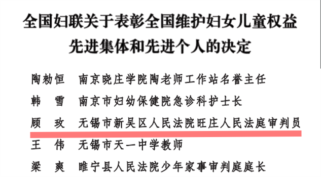 江苏法院系统共有8位同志荣获全国维护妇女儿童权益先进个人称号,其中就包括无锡市新吴区人民法院旺庄人民法庭审判员顾玫,她也是无锡法院系统唯一获此殊荣的同志。