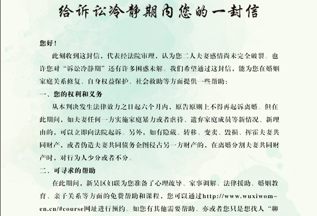 为深化诉源治理和多元解纷工作,工作室累计在辖区各家事调解点投放“大玫解忧信箱”8个,让群众找到“讲贴心话、解烦心事”的途径;为疏导“诉讼冷静期”内当事人的情绪、规范其权利义务,工作室出具“给诉讼冷静期内您的一封信”,为第一次判决不准离婚后的当事人提供三次免费咨询及帮助服务;为及时、有效保护家庭暴力受害者的合法权益,工作室联合无锡中院制作《人身安全保护令的问答与操作手册》,在全市范围推广使用。