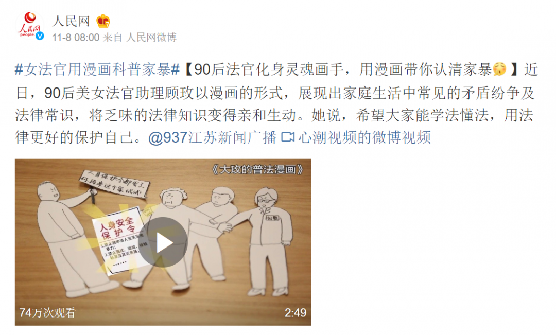 “主理人”顾玫受无锡广电邀请,在最高人民法院和B站支持下,开启全国首场反家暴公益直播。2021年1月,顾玫受最高人民法院《人民法院报》邀请,赴北京参加《民法典·法官说法》全国普法网络直播,观看人数超10万,直播间弹幕火爆、热议不断。