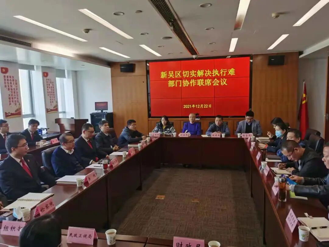 12月22日,新吴区委政法委组织召开切实解决执行难部门协作联席会议,区委政法委副书记王松、区纪委监委派驻第五纪检监察组组长王挺、区法院党组成员王秦飞、区检察院副检察长徐子良、新吴区切实解决执行难部门协作联席会议成员单位分管领导、区法院执行局全体员额法官参加会议。区法院执行局局长赵玥珑主持会议。