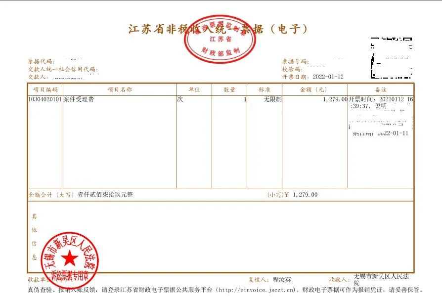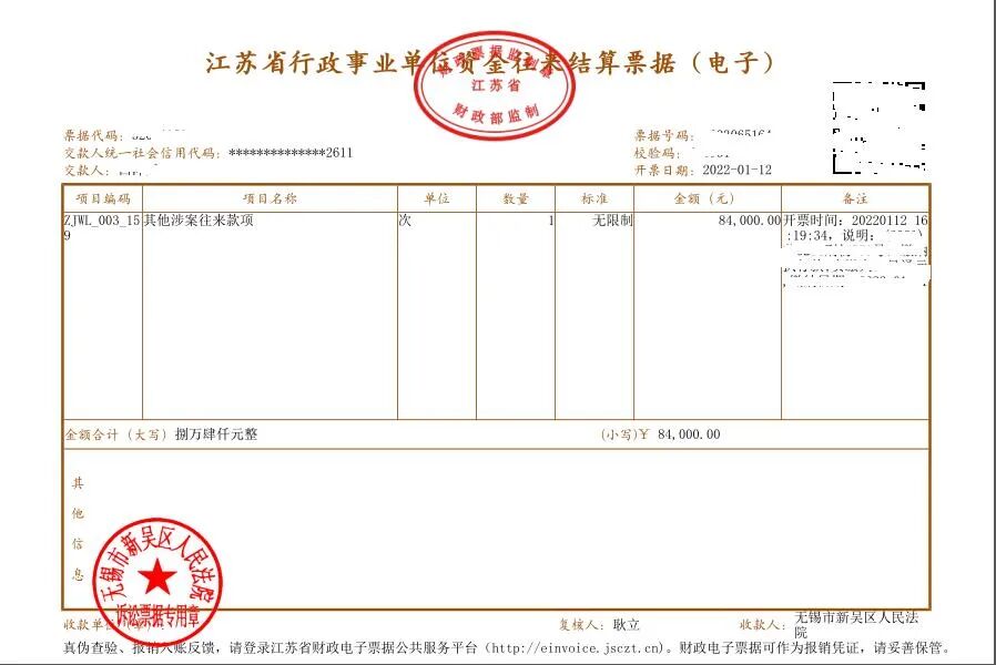 为方便当事人诉讼费缴纳,规范法院诉讼费、涉案款项的收发管理,近期,江苏省高级人民法院在全省法院开展非税收入电子票据改革。改革后,法院诉讼收费和缴款等开具的票据由纸质变为电子形式。无锡市新吴区人民法院于2022年1月12日正式启用电子票据。