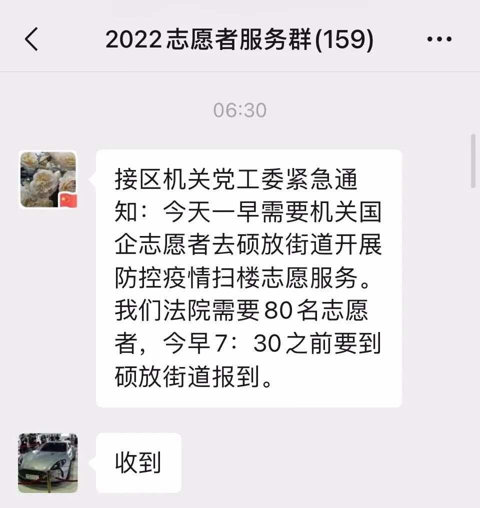 从清晨6点半开始,短短一个小时内,80名法院志愿者就陆续集结到位,这之中既有带头垂范的院庭长,又有主动“请战”的年轻干警。