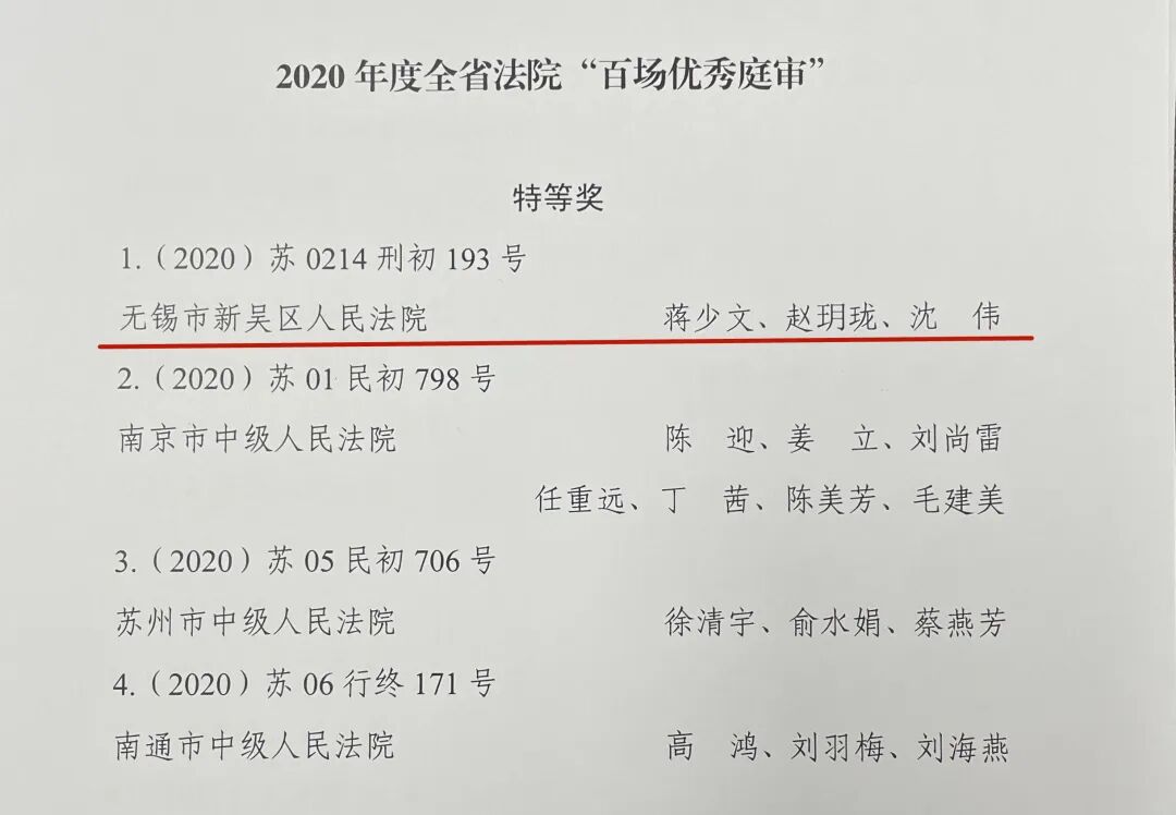 新吴法院党组成员、副院长蒋少文,执行局局长赵玥珑(原刑事审判庭庭长)、人民陪审员沈伟组成合议庭审理的一起刑事案件的庭审,被评为2020年度全省法院“百场优秀庭审”特等奖!