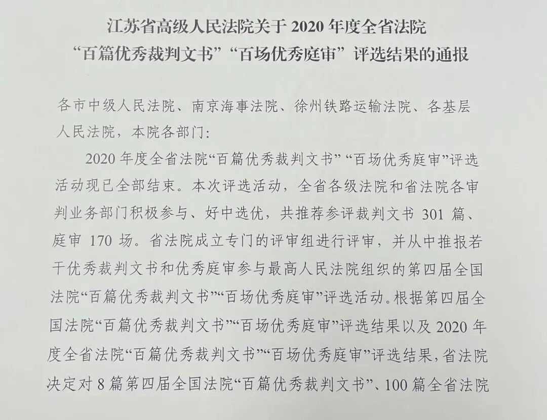 近日,江苏高院公布了2020年度全省法院“百篇优秀裁判文书”“百场优秀庭审”评选结果,无锡两级法院多篇文书、多场庭审榜上有名。