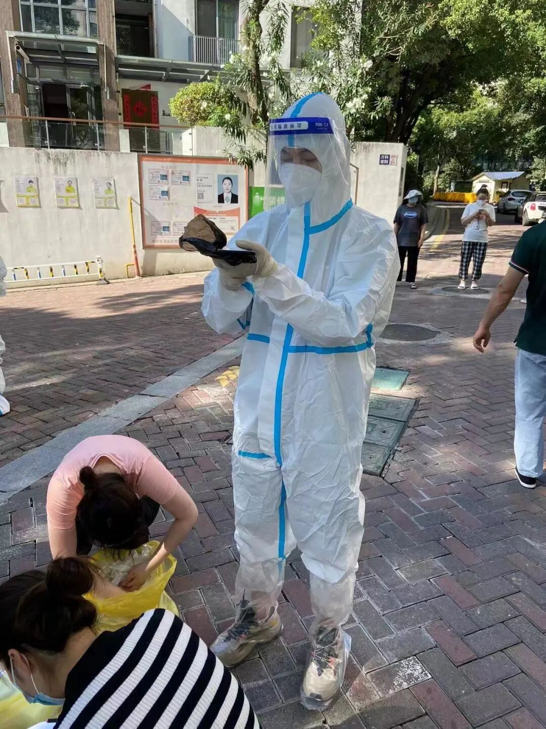 从清晨5点半开始,袁浩荧已经陆续查验指导了近2000名居民。随着温度的上升,穿在身上的防护服格外闷人,可袁浩荧仍然坚持在岗。九点半,法院带队组长孙森发现她体力不支,有中暑迹象,马上将其劝离岗位。