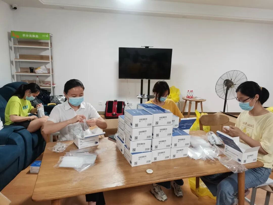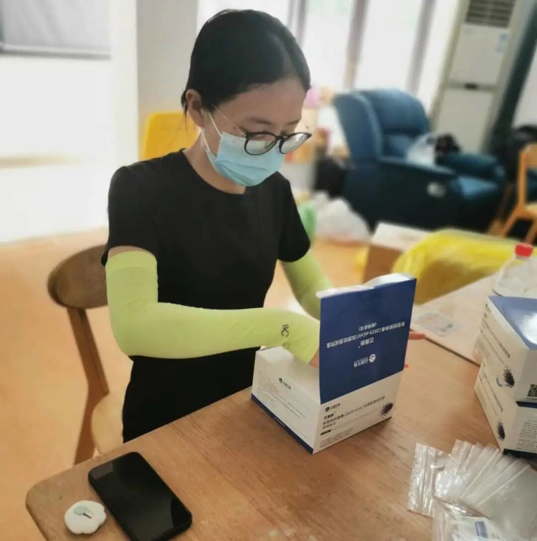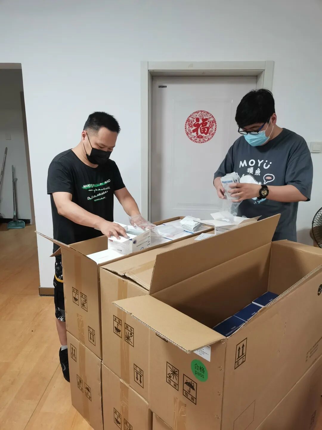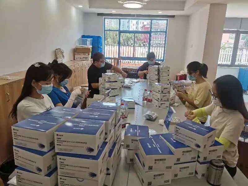 “第1箱完成!用时20分钟!”“第5箱完成!用时15分钟!”“第14箱完成!用时9分钟!”“第20箱完成!”晚上九点半,在清点完20箱共计20000份抗原后,首先完成任务的法院志愿者们伸着僵直的胳膊,结束了一天志愿工作……
