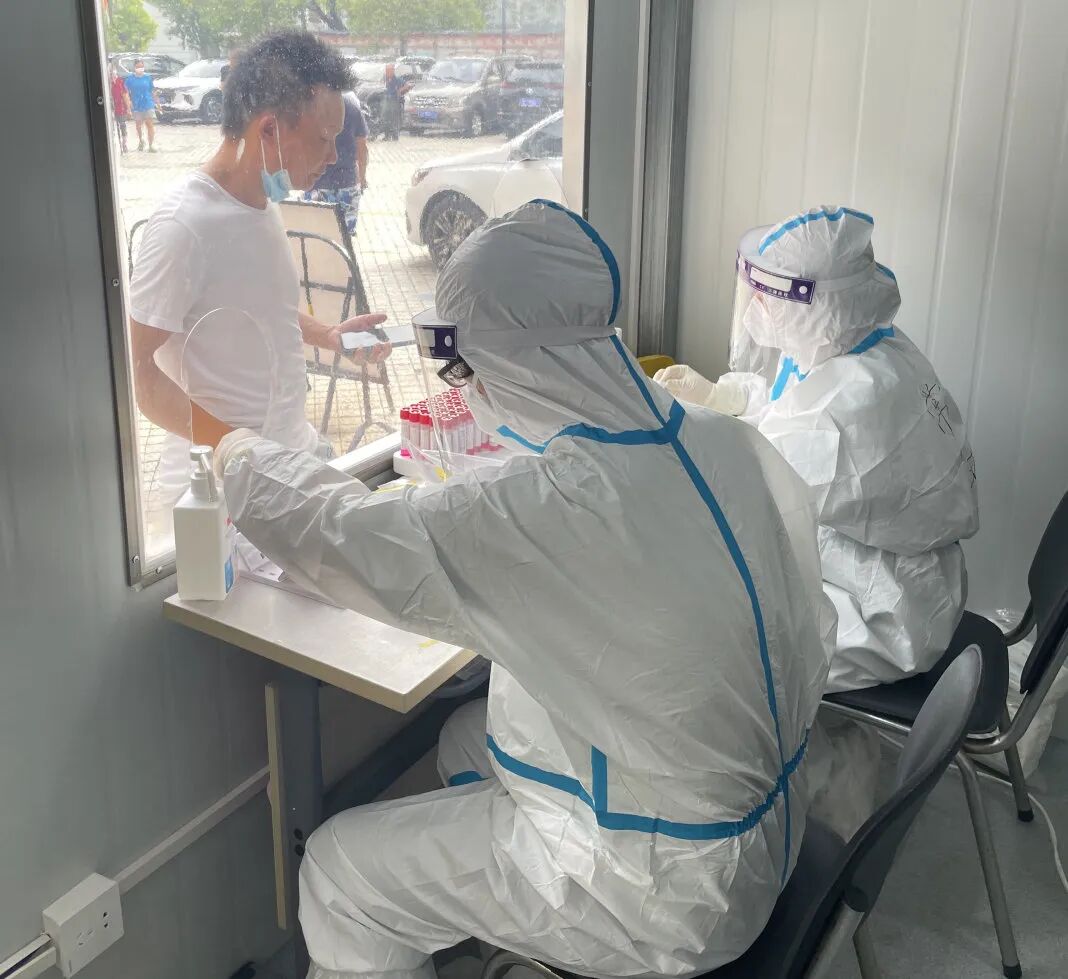 六点不到,四位志愿者就上岗了。核酸小屋中,他们化身“大白”,配合医务工作者完成人员信息录入工作。酷暑当下,天气炎热,人难受,机器也难受。工作手机就多次因为受热重启,但大家依然克服焦急情绪,一边采样一边封装,手上不停,嘴上也不停:“请拿好身份证,请带好口罩,请慢慢来不着急”。
